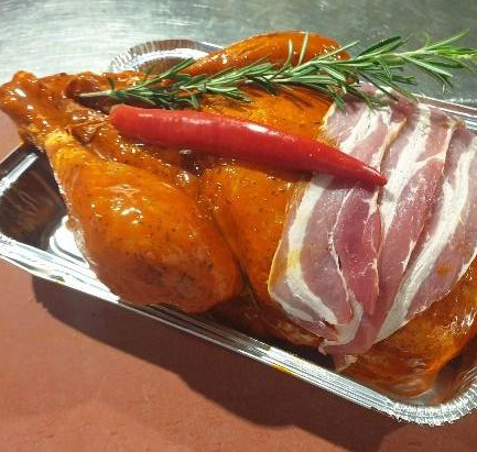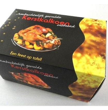 Hele kalkoen, zonder borstbeen gevuld met kipgehakt, notenmix, krenten, rozijnen en cranberry, ± 3,3 kg.