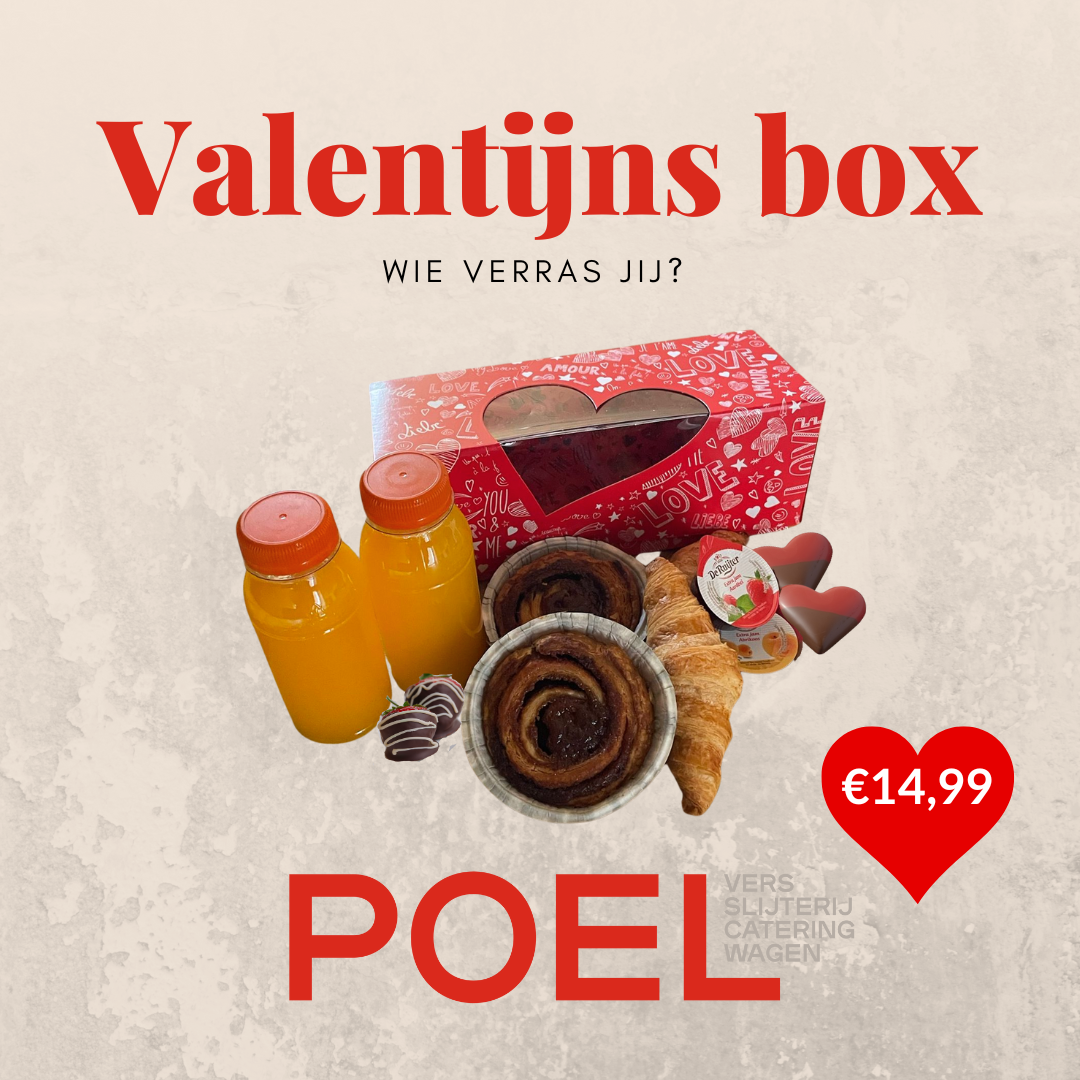 Met deze box kan de liefde niet meer stuk. Gevuld met mini croissants, jam, cinnamon buns, chocolade aardbeien, chocolade hartjes en 250 ml verse jus. Vier jij de liefde?